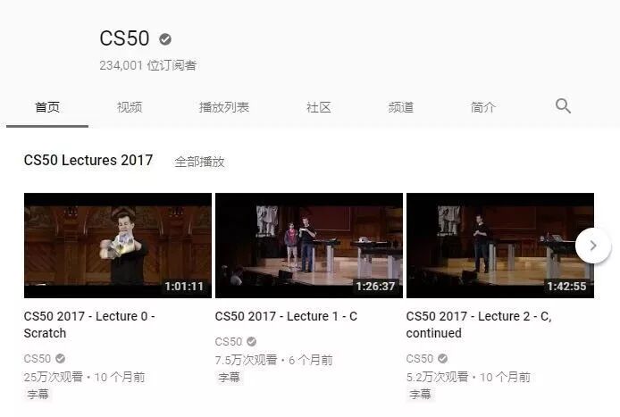 因为课程不错,所以今天就推荐给需要的同学。这个课程每年都会更新,虽然课程是免费的,但是质量还是挺高的。目前 youtube 上 「CS50 频道」已经更新到 2017 年的课程啦,下面是截图: